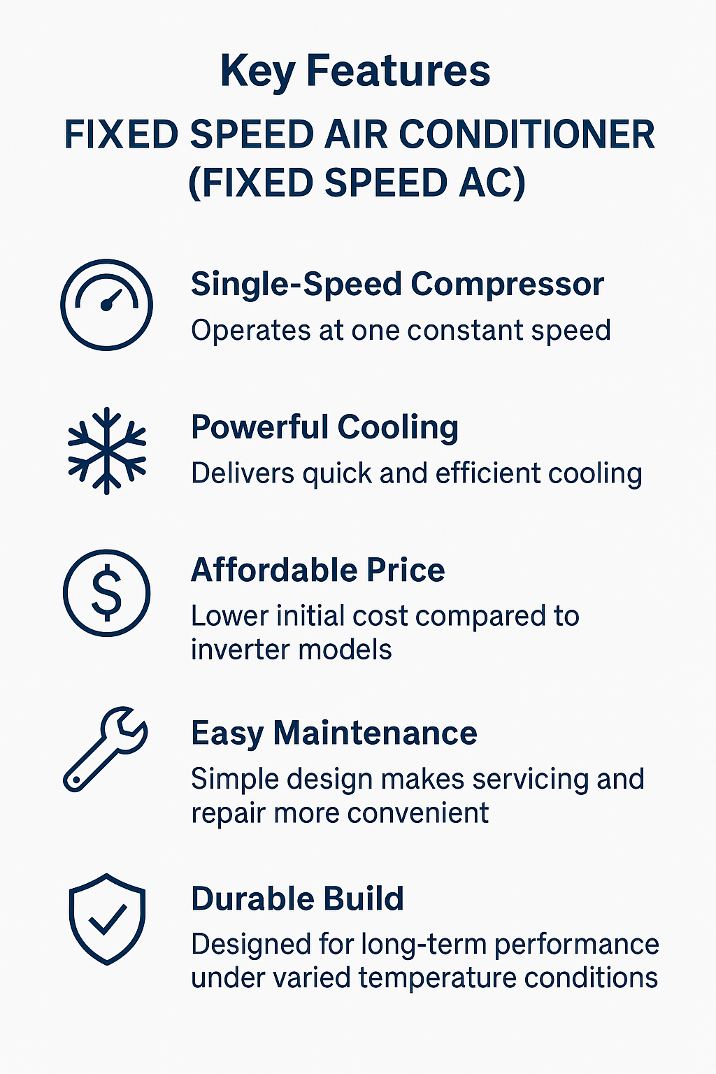 A Fixed Speed Air Conditioner (Fixed Speed AC) is a traditional and reliable cooling system known for its affordable cost and powerful performance. It operates using a single-speed compressor, which runs at full capacity whenever cooling is required and turns off once the desired temperature is reached. This makes it an ideal choice for users who want strong cooling performance at a budget-friendly price.
