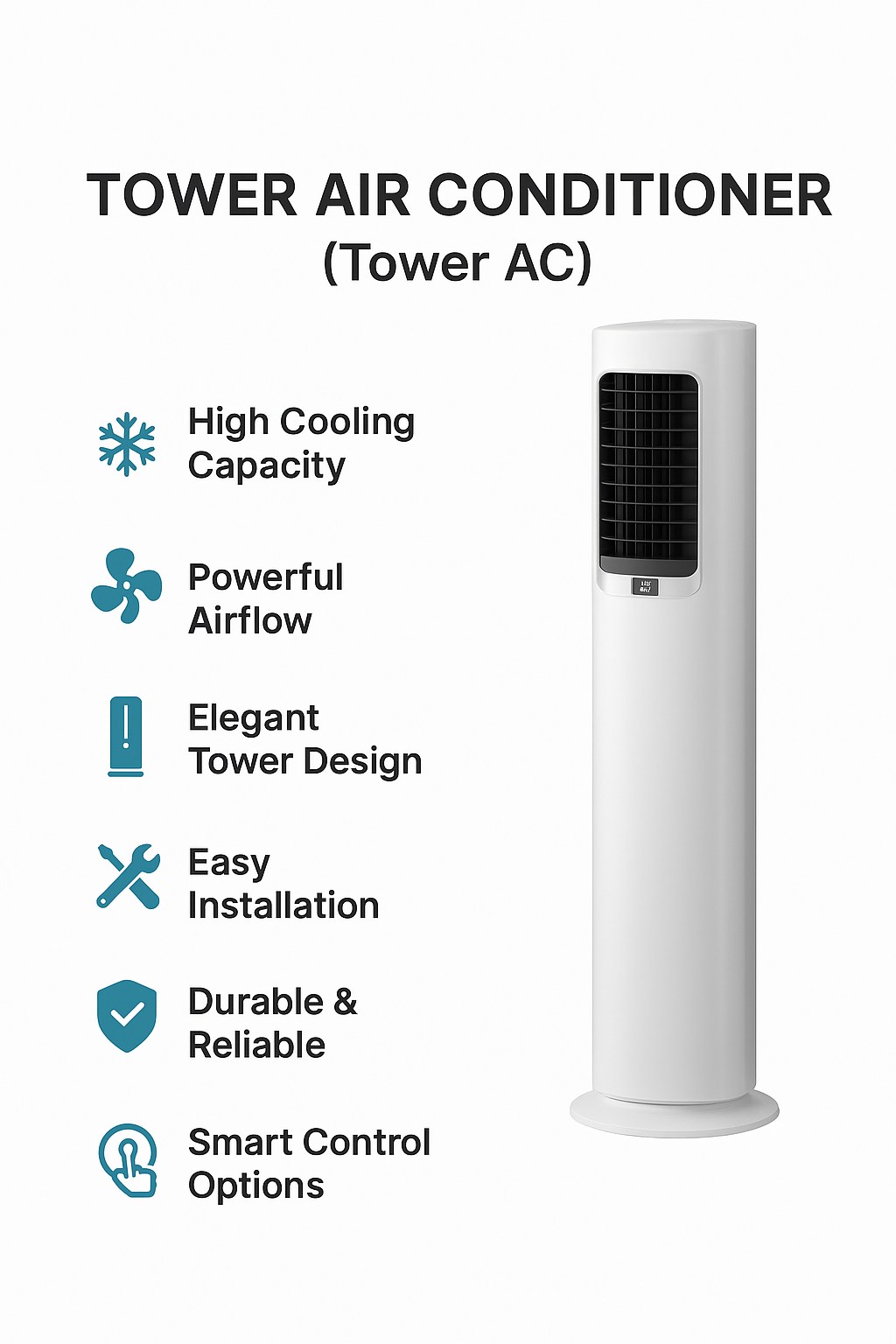 A Tower Air Conditioner (Tower AC), also known as a Floor Standing AC, is a powerful and high-capacity cooling system designed for large spaces such as offices, halls, showrooms, and commercial establishments. It features a vertical, tower-like design that delivers superior air throw and wide coverage, making it ideal for areas where wall-mounted units are impractical or insufficient.